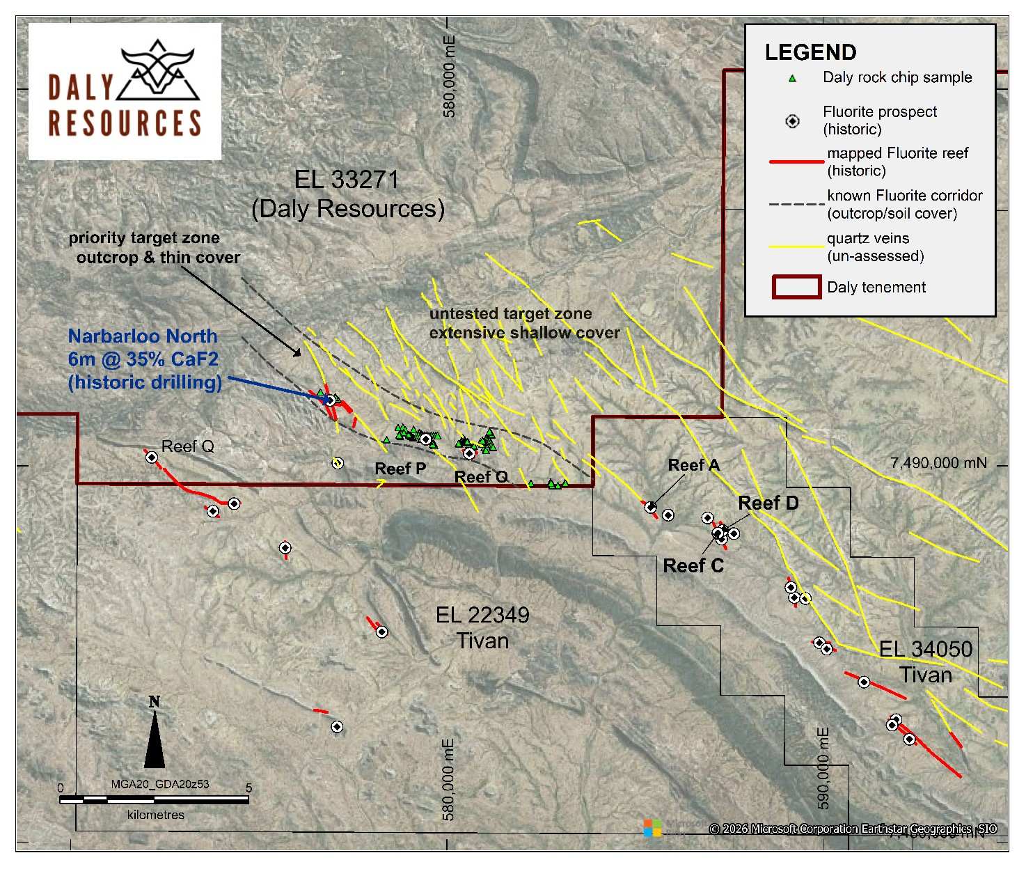 The Huckitta Fluorite Project is located 230km northeast from Alice Springs and is easily accessed via the Plenty Highway. Daly’s tenure lies immediately to the north of the Sandover Fluorite Project (ASX: TVN).